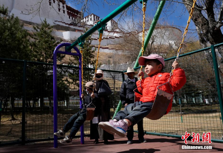 3月13日,小朋友在西藏拉薩宗角祿康公園蕩秋千。坐落于布達(dá)拉宮腳下的宗角祿康公園是拉薩民眾戶外活動的一大場所。隨著3月春回拉薩,大家來到公園散步、健身,一片春意盎然的景象。中新社記者 李林 攝