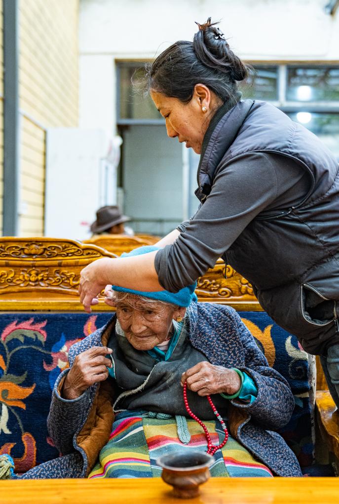 孫媳婦在幫助玉珍奶奶整理頭巾(3月12日攝)。新華社記者 丁增尼達(dá) 攝