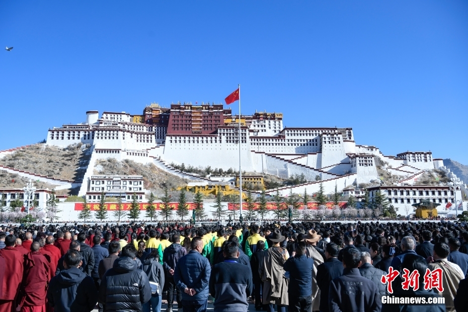 3月28日,西藏各族各界人士聚集在拉薩布達拉宮廣場,升國旗、唱國歌,參加西藏百萬農(nóng)奴解放66周年紀念活動。圖為升國旗儀式現(xiàn)場。