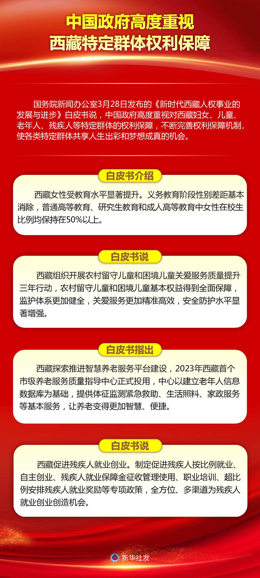 國務院新聞辦公室28日發(fā)布的《新時代西藏人權事業(yè)的發(fā)展與進步》白皮書說,中國政府高度重視對西藏婦女、兒童、老年人、殘疾人等特定群體的權利保障,不斷完善權利保障機制,使各類特定群體共享人生出彩和夢想成真的機會。