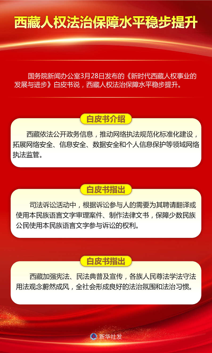 國務(wù)院新聞辦公室28日發(fā)布的《新時(shí)代西藏人權(quán)事業(yè)的發(fā)展與進(jìn)步》白皮書說,西藏人權(quán)法治保障水平穩(wěn)步提升。