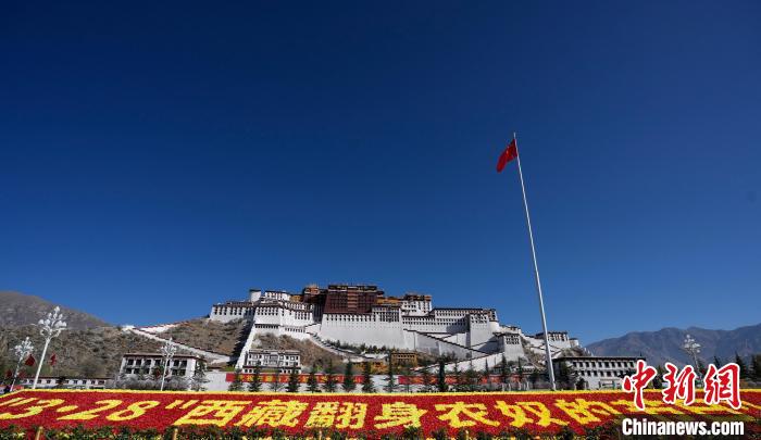 圖為3月28日,西藏布達拉宮廣場擺放西藏百萬農奴解放紀念日標語。李林 攝