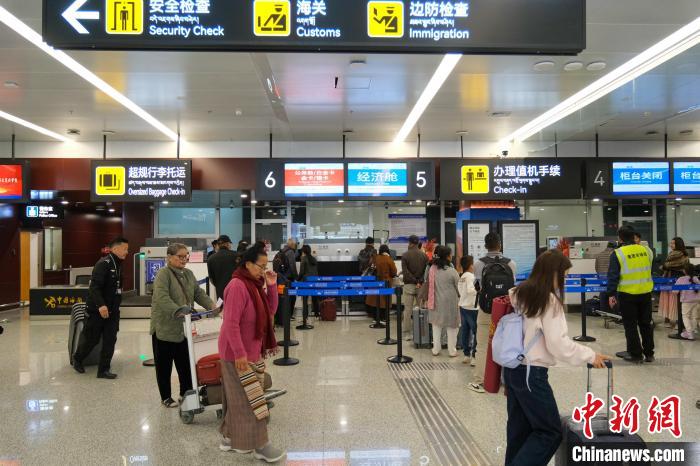 圖為3月31日,由拉薩飛往尼泊爾博卡拉的旅客在拉薩貢嘎國(guó)際機(jī)場(chǎng)辦理乘機(jī)手續(xù)。江飛波 攝