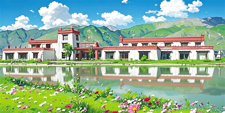 “我就是想以動畫風(fēng)格給大家展示不一樣的堆龍。”旦增拉姆說。只見她又將照片導(dǎo)入AI圖片生成軟件內(nèi),AI自動識別圖像元素——經(jīng)幡的布料特性、水流的物理參數(shù)、建筑材質(zhì)的反光數(shù)據(jù)。輕點“生成”按鈕,1分23秒后,一張動畫風(fēng)格的Shadada CoffeeX新型公共文化空間的圖片便呈現(xiàn)在眼前。重點不是技術(shù),是審美把關(guān),旦增拉姆指著屏幕上的失敗案例:“AI把青稞田處理成糖果色卡通,把圖書館渲染成賽博朋克風(fēng)格。我每天要調(diào)整無數(shù)次參數(shù),就像教AI理解什么是藏地美學(xué)?!彼米瞵F(xiàn)代化的數(shù)字工具,“描繪”著堆龍德慶區(qū)新的光影詩篇。