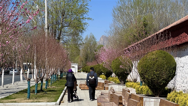 過(guò)了羅布林卡路繼續(xù)往市區(qū)方向,區(qū)直工委路上的紫葉李、櫻花成團(tuán)怒放,來(lái)來(lái)往往的車(chē)輛和行人與這一排排花樹(shù)形成了最具煙火氣的城市美景。漫步街頭,偶有花香飄過(guò),一路走來(lái),花瓣已落肩頭,這就是拉薩送給人們的最好的春日禮物。