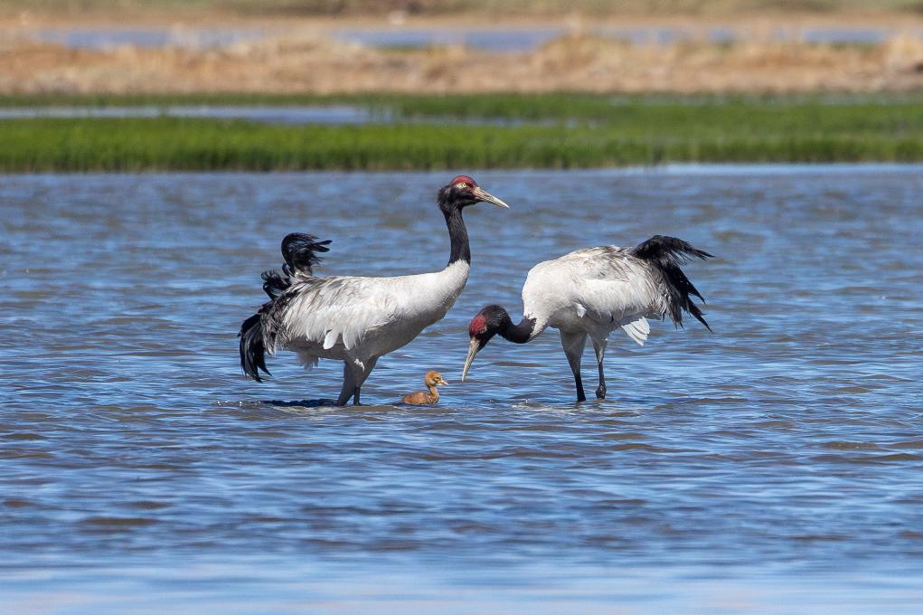 2024年6月9日,一對(duì)黑頸鶴帶著雛鳥在西藏那曲市申扎縣一處濕地棲息、覓食。新華社記者 旦增尼瑪曲珠 攝