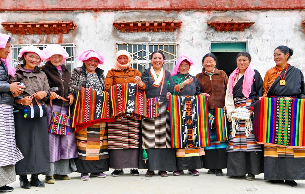 在海拔4000米以上的西藏那曲市色尼區(qū)木托村,婦委會(huì)主任措吉卓嘎(右五)和合作社成員展示部分編織產(chǎn)品。新華社記者 張汝鋒 攝