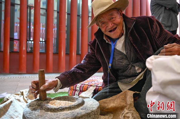 圖為工作人員手工磨糌粑。貢確 攝