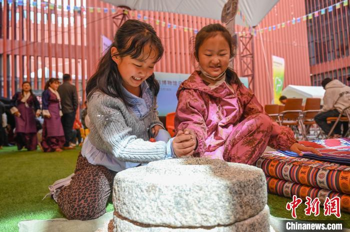 圖為市民體驗手工磨糌粑。貢確 攝