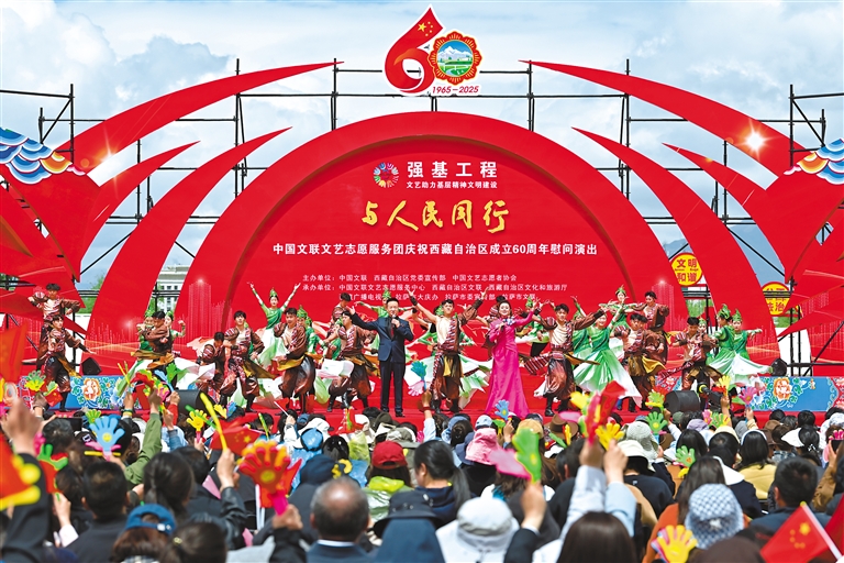 上午10時(shí)整,“與人民同行”中國(guó)文聯(lián)文藝志愿服務(wù)團(tuán)慶祝西藏自治區(qū)成立60周年慰問(wèn)演出,在歌舞《鼓舞西藏》的熱烈氛圍中正式開(kāi)場(chǎng)。
