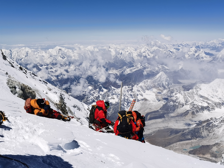 2020年5月27日,2020珠峰高程測量登山隊成功登頂世界第一高峰珠穆朗瑪峰。他們在峰頂豎立覘標,安裝GNSS天線,開展各項峰頂測量工作。新華社特約記者 扎西次仁 攝