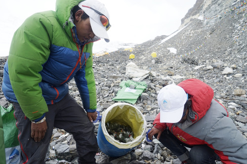 圖為西藏拉薩喜馬拉雅登山向導學校的向導們在珠峰進行垃圾清理(2016年5月21日攝)。 新華社發(fā)(扎西次仁攝)
