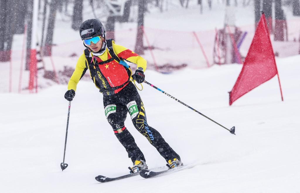 中國滑雪登山運動員玉珍拉姆在新疆富蘊縣可可托海國際滑雪度假區(qū)進行的全國首屆滑雪登山冠軍賽短距離(女子組)比賽中。(2023年4月8日攝)。新華社記者 胡虎虎 攝