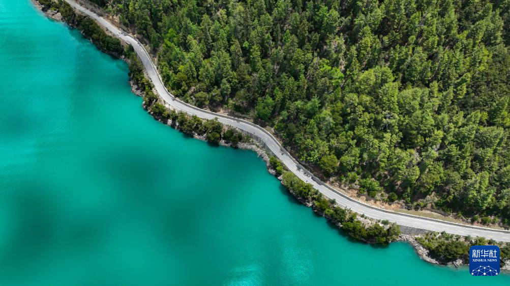 巴松措岸邊蜿蜒的公路(5月28日攝,無人機(jī)照片)。新華社記者 晉美多吉 攝