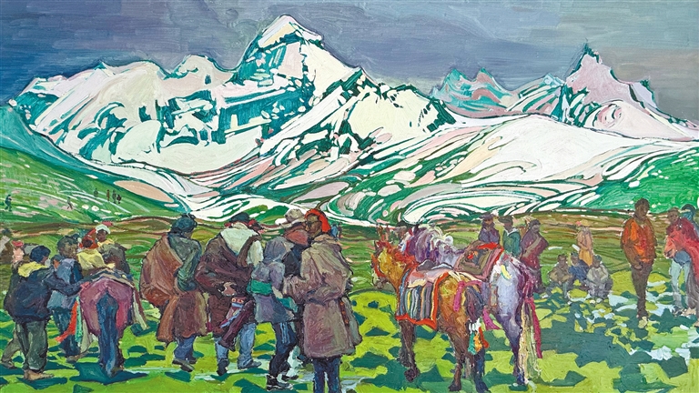 澤巴珍油畫作品《雪域情》。