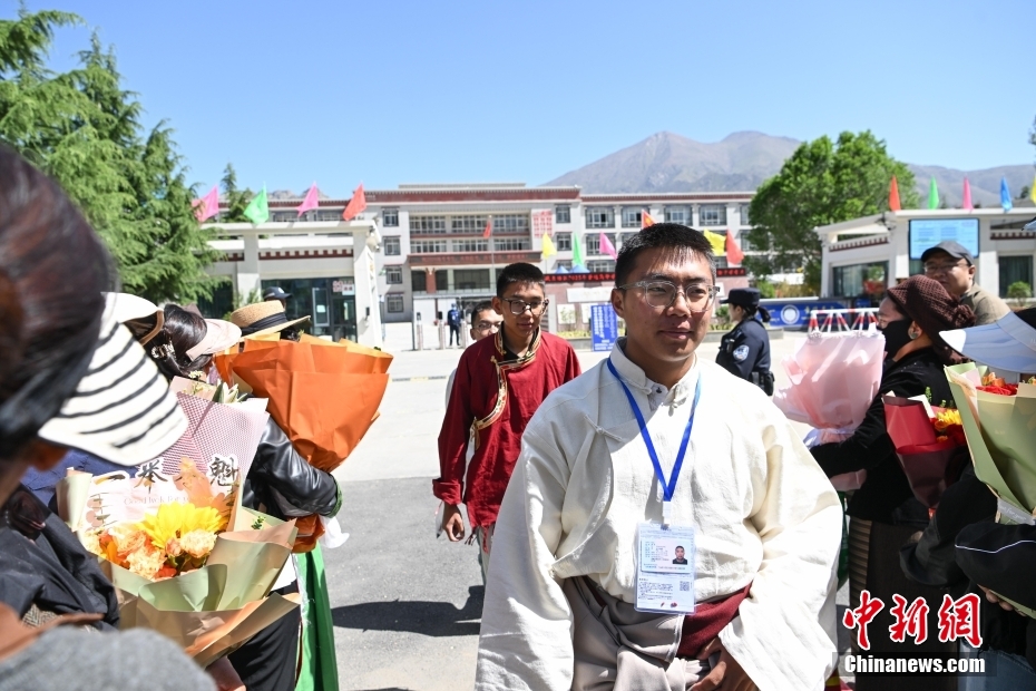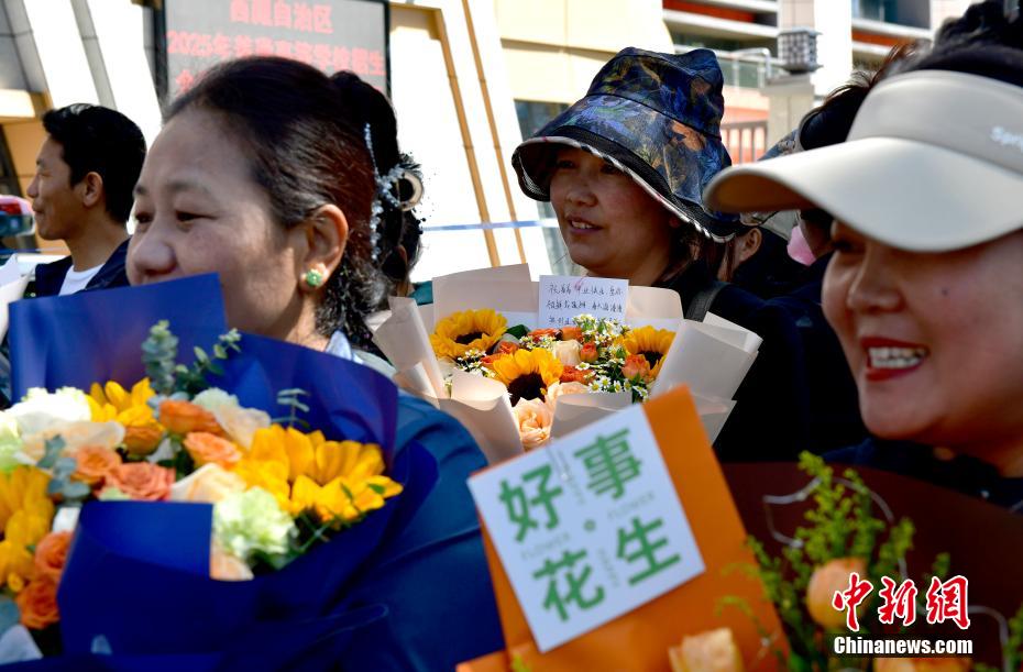 6月9日,西藏拉薩江蘇實驗中學(xué)考點外親友為考生送鮮花。當(dāng)日,西藏自治區(qū)2025年普通高考完成所有科目考試,2025年西藏高考落下帷幕。中新社記者 貢嘎來松 攝