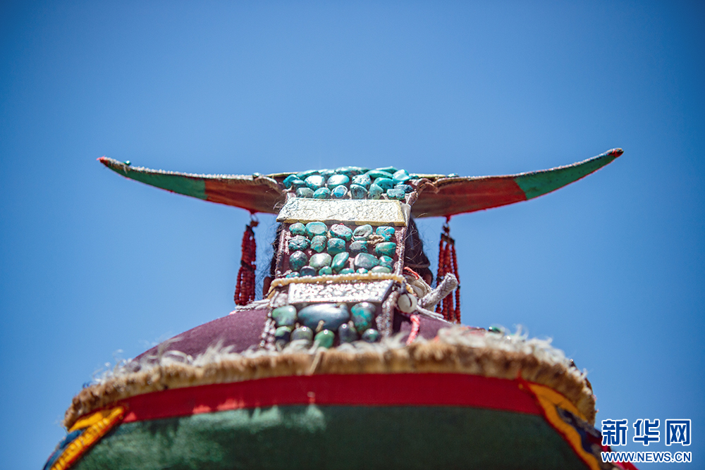 圖為裝點綠松石的普蘭服飾頭飾(6月10日攝)。新華網(wǎng) 旦增努布 攝