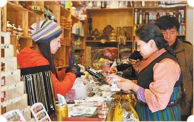 游客在吉隆鎮(zhèn)吉甫村購買當(dāng)?shù)靥厣唐?。拉巴宗吉攝
