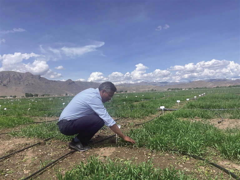 西藏自治區(qū)農(nóng)牧科學(xué)院農(nóng)業(yè)研究所副研究員達(dá)瓦頓珠在田里查看青稞長(zhǎng)勢(shì)。