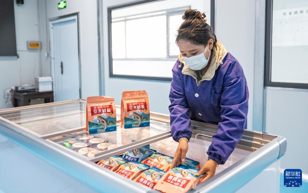 工作人員在車間內(nèi)將亞東鮭魚的加工產(chǎn)品放入冷藏柜(6月19日攝)。新華社記者 丁增尼達 攝