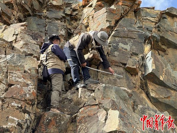 文物普查員正在對巖畫展開探查。中青報(bào)·中青網(wǎng)記者 張玘云/攝