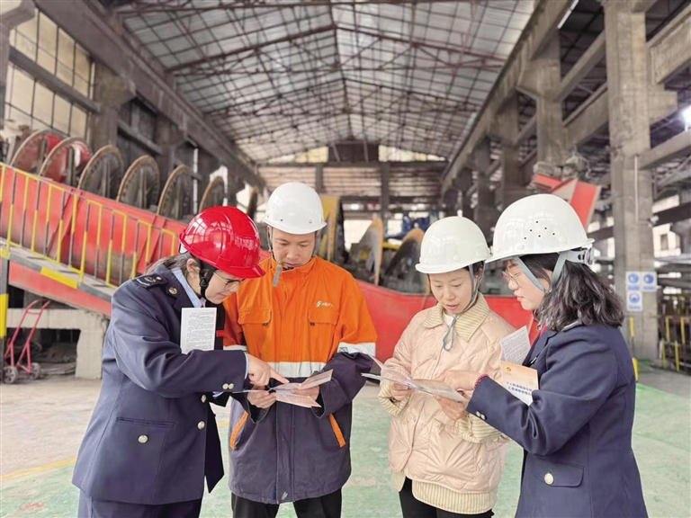 稅務(wù)工作人員在礦山企業(yè)生產(chǎn)經(jīng)營場(chǎng)所開展稅費(fèi)宣傳。圖由自治區(qū)稅務(wù)局提供