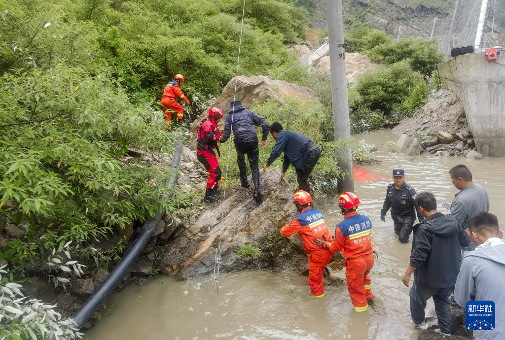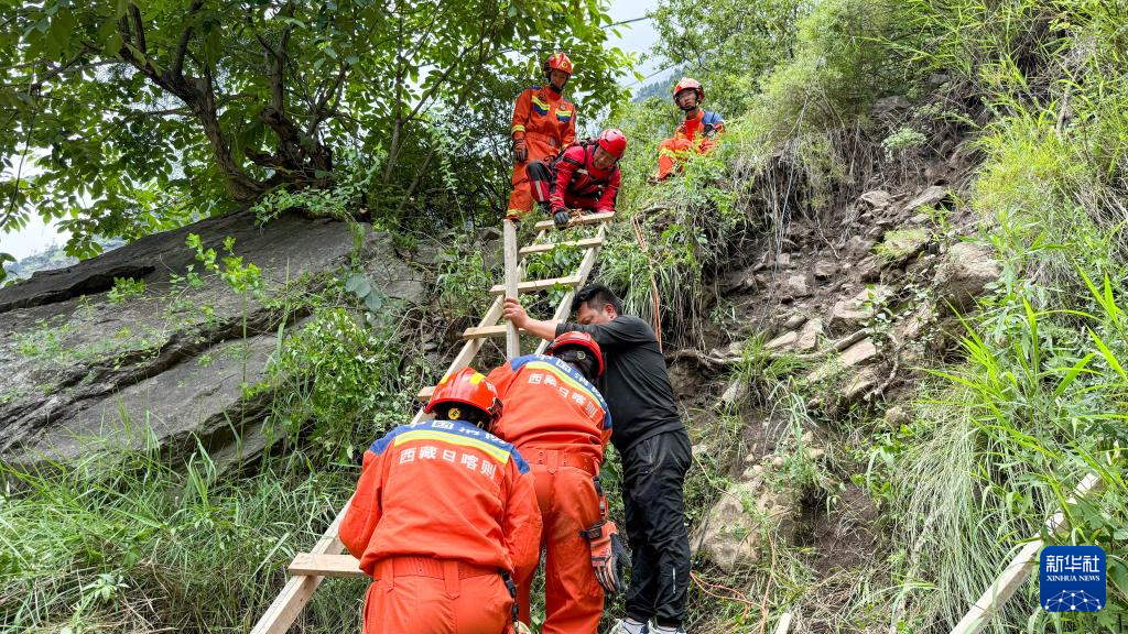 7月8日,西藏消防救援總隊救援人員在救災現(xiàn)場疏散被困人員。新華社發(fā)(徐達富攝)
