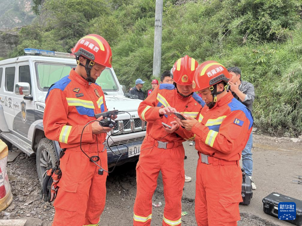 7月8日,西藏消防救援總隊救援人員在救災現(xiàn)場搭建4G單兵圖傳系統(tǒng)。新華社發(fā)(徐達富攝)