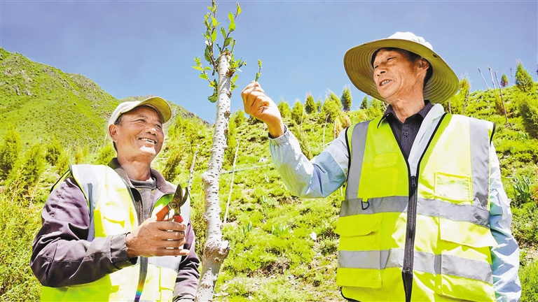 在2號片區(qū),一支特殊養(yǎng)護隊伍映入眼簾。十幾位藏族村民在技術員的指導下修剪枝條,掌握技術后將成為專業(yè)管護人員。村民的動作略顯生疏,但專注的神情流露出對樹苗的珍視。