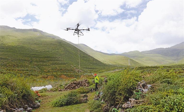 南北山綠化工程墨竹工卡縣段11號片區(qū)無人機在運送苗木。