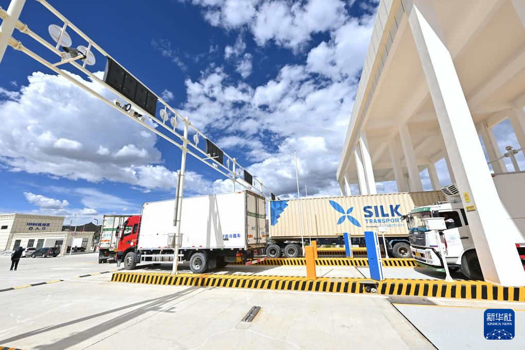 7月16日,貨車通過日喀則國際陸地港出口貨物查驗場卡口。新華社記者 李鑫 攝