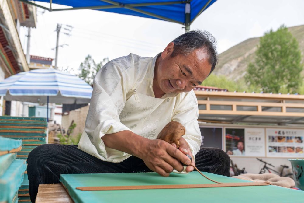這是一名傳承西藏傳統(tǒng)雕刻修復(fù)技藝的雕刻師(8月6日攝)。西藏傳統(tǒng)雕刻修復(fù)技藝入選西藏自治區(qū)級(jí)非物質(zhì)文化遺產(chǎn)代表性項(xiàng)目名錄。