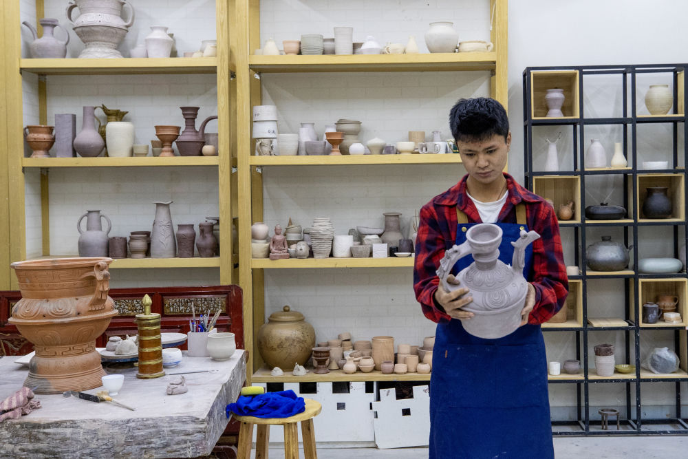 8月6日,一名制陶師在制作陶器。藏族傳統(tǒng)泥陶雕塑制作技藝入選西藏自治區(qū)級(jí)非物質(zhì)文化遺產(chǎn)代表性項(xiàng)目名錄。