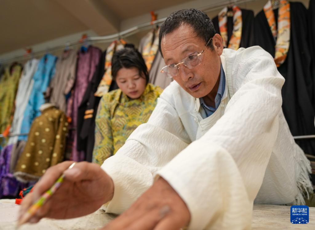 在拉薩雪堆白傳統(tǒng)手工藝術(shù)學(xué)校,60歲的西藏自治區(qū)級(jí)非物質(zhì)文化遺產(chǎn)項(xiàng)目藏族服飾(拉薩服飾)代表性傳承人洛桑麥朗,與學(xué)徒一道研究、制作藏裝。從藝四十余載,他培養(yǎng)了百余名弟子,還參與編撰教材、建立藏族服飾數(shù)據(jù)庫等工作。在他的巧手下,新式藏裝將傳統(tǒng)與現(xiàn)代交融,讓非遺技藝與現(xiàn)代審美碰撞,成為街頭一道靚麗的風(fēng)景。