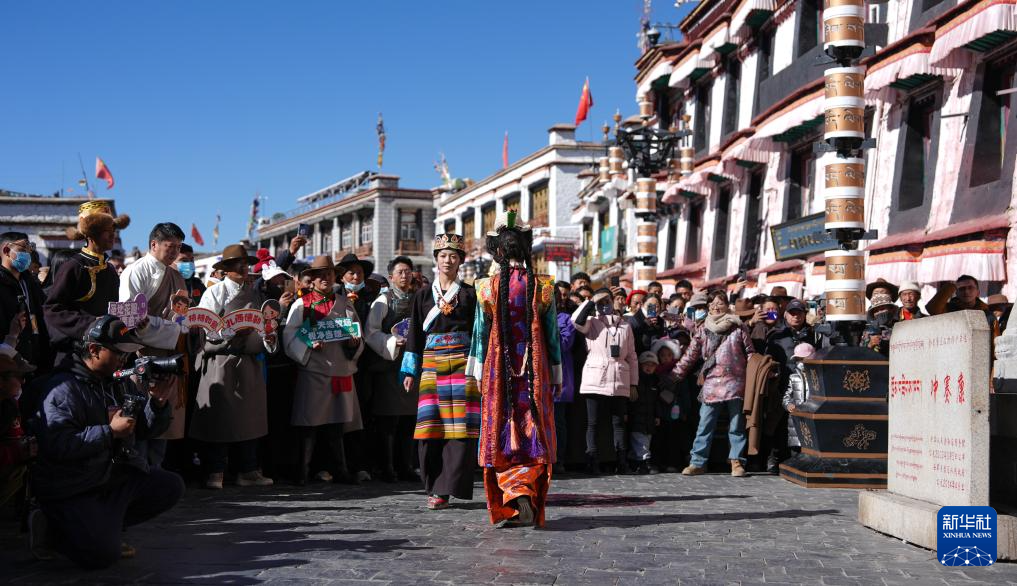 模特在拉薩八廓街“繁飾自然·衣彩拉薩——拉薩新年服飾秀”活動(dòng)中巡游(1月3日攝)。新華社記者 晉美多吉 攝