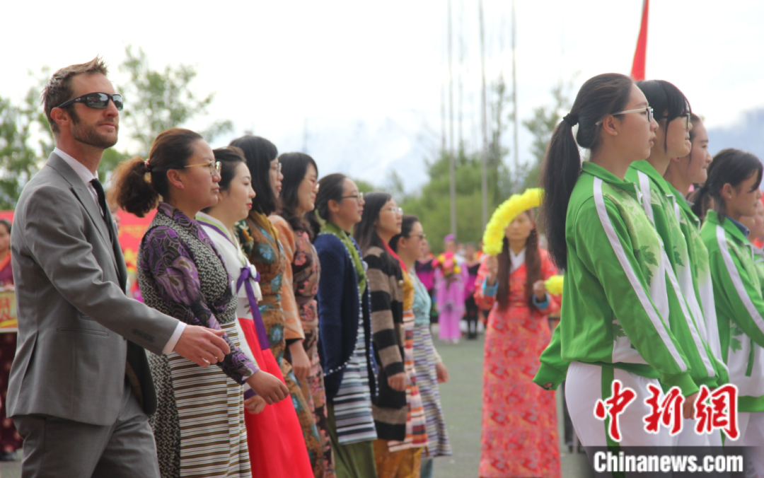 2017年5月11日,西藏大學(xué)舉行第二十八屆田徑運(yùn)動(dòng)會(huì),數(shù)十名外籍留學(xué)生和外籍教師參加了開(kāi)幕式。圖為開(kāi)幕式中旅游與外語(yǔ)學(xué)院方隊(duì) 劉蔭 攝