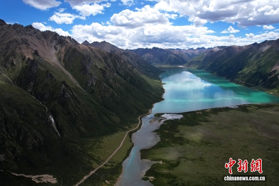 西藏那曲市,嘉乃玉錯國家濕地公園碧波蕩漾,湖邊綠意盎然,在藍(lán)天白云映襯下,景色如畫。(無人機(jī)照片)中新社記者 李林 攝