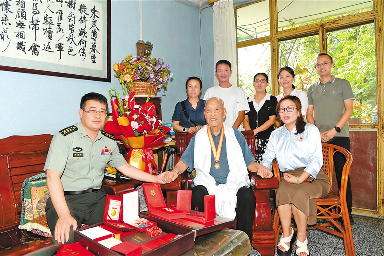 圖為工作人員向抗戰(zhàn)老戰(zhàn)土徐明亮(前排中)頒發(fā)紀念章。記者 洛?!z