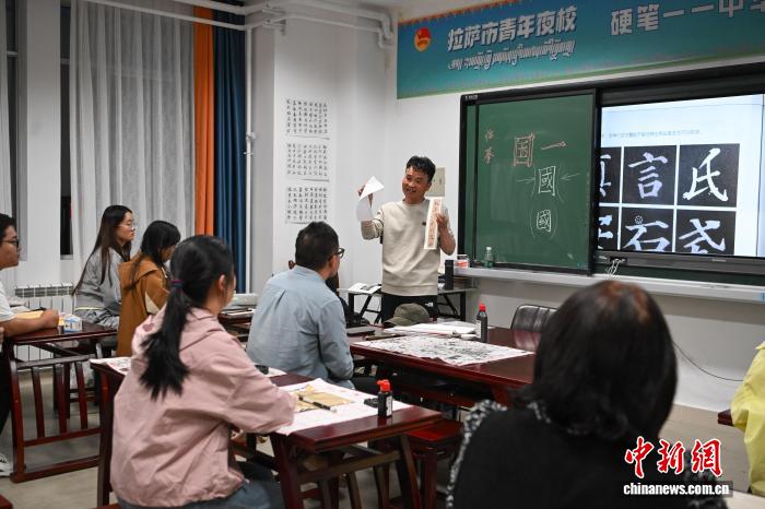 9月1日,2025年西藏自治區(qū)拉薩市第二期“青年夜?!闭介_班。圖為夜校學(xué)員在上書法課。中新社記者 貢嘎來松 攝