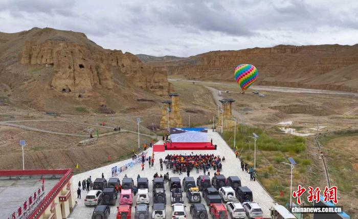 9月1日,參加“天上阿里·云巔自駕”活動的游客在札達縣霞義溝土林景區(qū)參加開幕式(無人機照片)。閆志國 攝