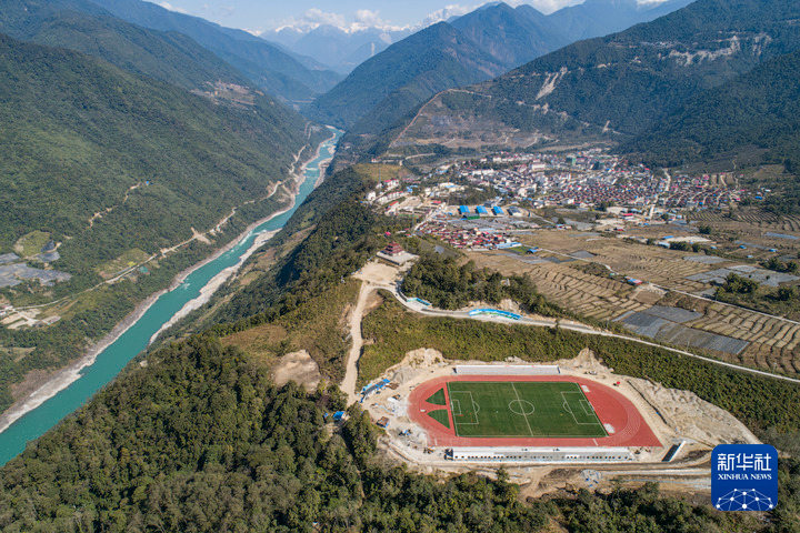 墨脫縣的11人制足球場(chǎng)位于雅魯藏布江邊(2021年2月13日攝,無人機(jī)照片)。新華社記者 孫非 攝
