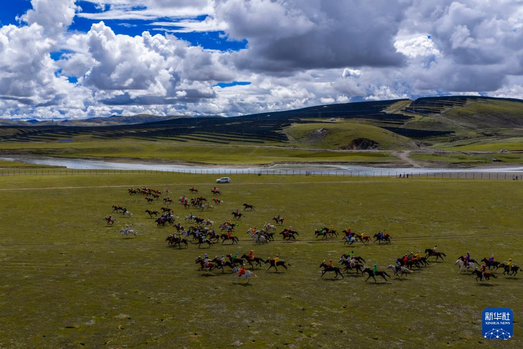 2025年那曲市恰青賽馬節(jié)上,騎手們?cè)趥鹘y(tǒng)大跑項(xiàng)目中馳騁(無人機(jī)照片,9月7日攝)。新華社記者 姜帆 攝