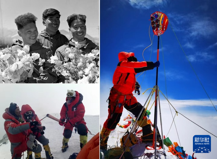 拼版照片:左上圖為1960年5月登上珠穆朗瑪峰峰頂?shù)闹袊?guó)登山隊(duì)隊(duì)員王富洲(右)、貢布(中)和屈銀華(資料照片,新華社發(fā));左下圖為2008年5月8日,北京奧運(yùn)圣火珠峰傳遞登山隊(duì)隊(duì)員羅布占堆(左)點(diǎn)燃第一棒火炬手吉吉手中的“祥云”火炬(新華社發(fā));右圖為2020珠峰高程測(cè)量登山隊(duì)隊(duì)員在珠穆朗瑪峰峰頂開展測(cè)量工作(2020年5月27日,新華社特約記者 扎西次仁 攝)