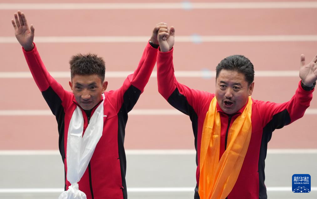 2021年9月23日,西藏隊(duì)選手多布杰(左)在第十四屆全運(yùn)會(huì)田徑項(xiàng)目上,以13分49秒16的成績(jī)奪得男子5000米冠軍。圖為他和教練員在頒獎(jiǎng)儀式上。新華社記者 李一博 攝