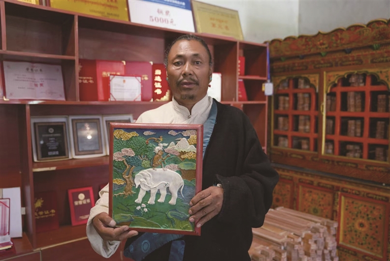 “‘酒香也怕巷子深’,以前普松雕刻這門手藝雖然精湛,但由于缺乏有效的宣傳推廣途徑,知曉的人并不多,產(chǎn)品銷售渠道也比較狹窄,只能靠少量的定制訂單維持?,F(xiàn)在旅游‘火’起來了,游客多起來了,越來越多的人有機(jī)會近距離接觸到普松雕刻的精美作品,產(chǎn)生了濃厚的興趣,生意也越來越好了。”斯曲說。