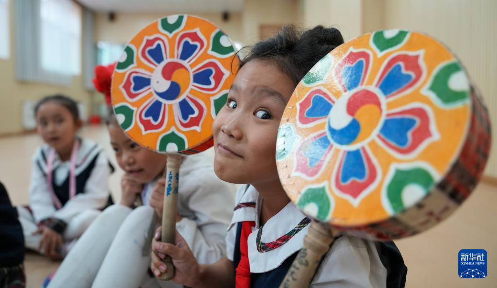 9月11日,在拉薩市實驗小學(xué),孩子在練習(xí)熱巴舞間隙捧起繪有彩紋的熱巴鼓。新華社記者 晉美多吉 攝