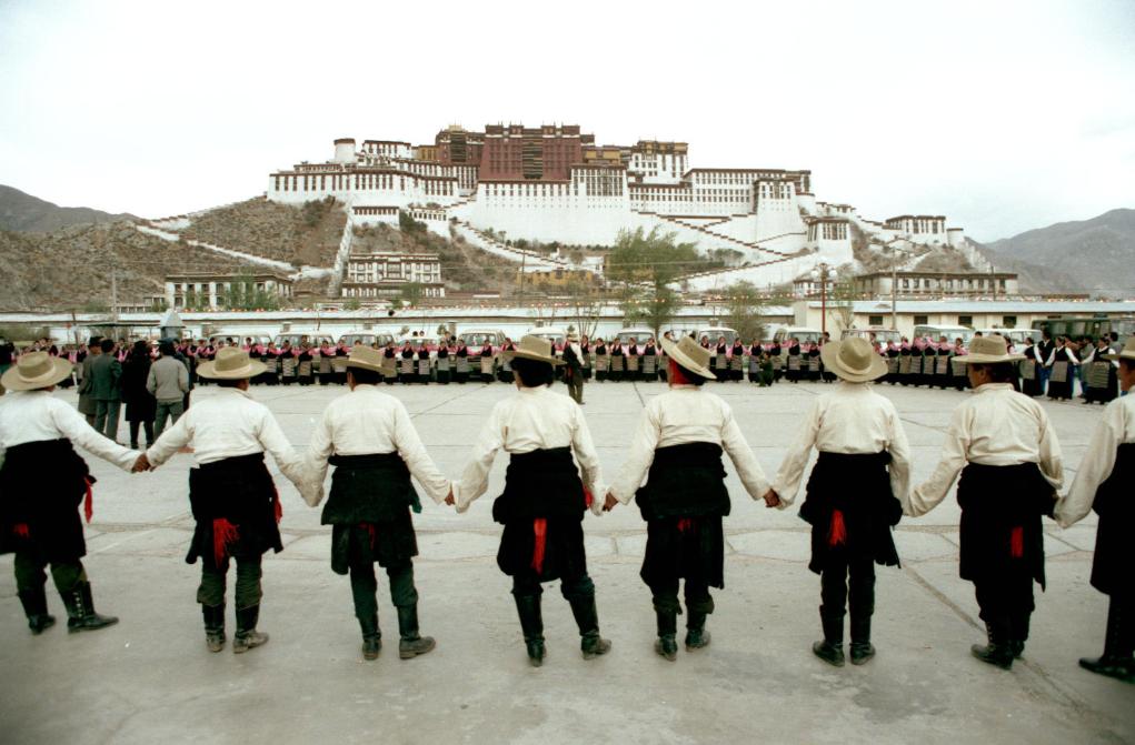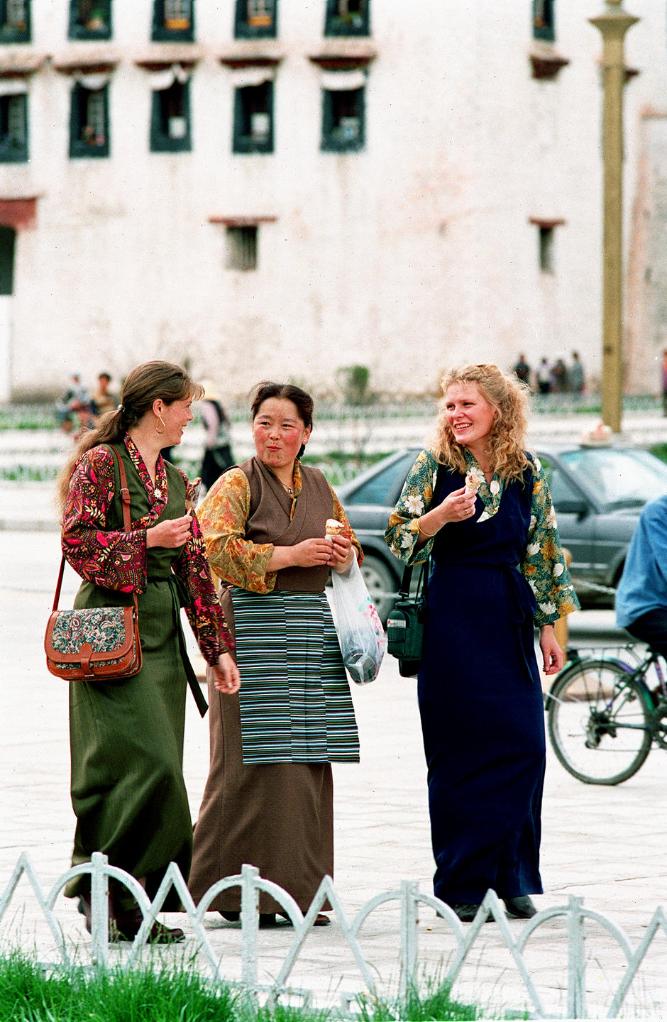 在拉薩市布達(dá)拉宮前,兩位身著藏裝的外國游客和一位藏族婦女交談。交通和旅游服務(wù)設(shè)施的逐步完善,為獨(dú)具風(fēng)情的西藏高原引來了更多的游客。(1997年11月13日發(fā))