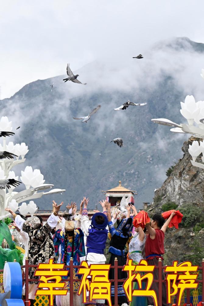 2025年8月21日上午,西藏各族各界干部群眾約2萬人歡聚拉薩市布達(dá)拉宮廣場,熱烈慶祝西藏自治區(qū)成立60周年。這是彩車上的演員通過布達(dá)拉宮廣場時(shí)放飛鴿子。新華社記者 申宏 攝