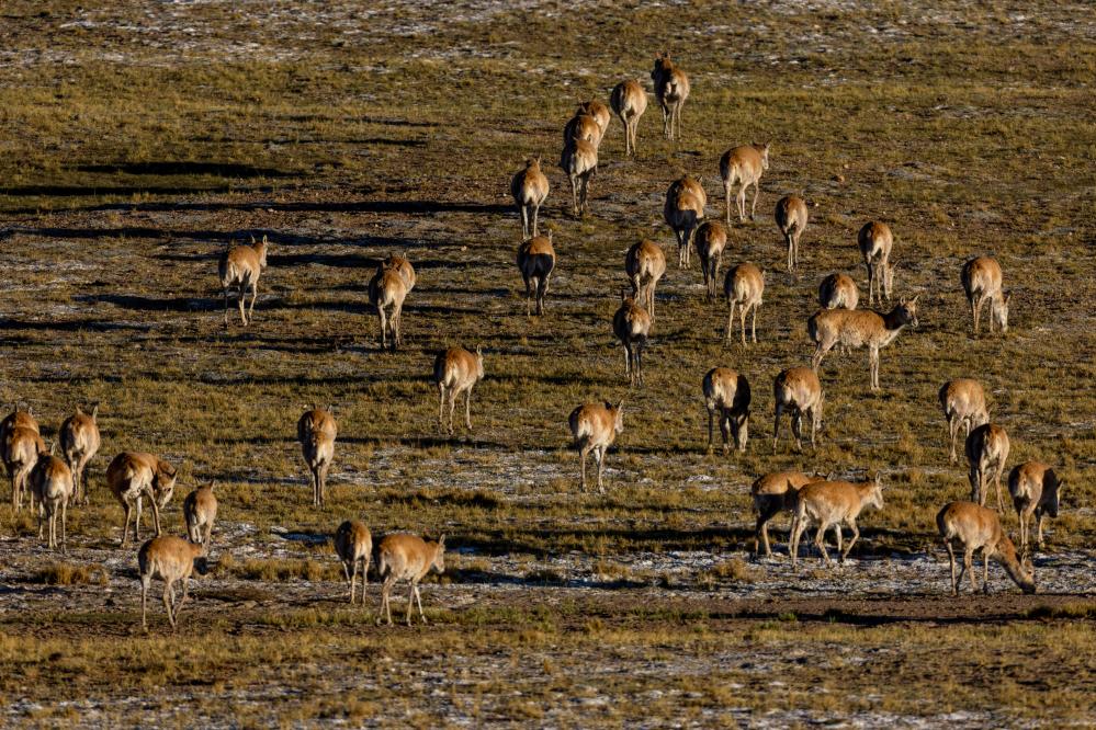 羌塘國家級(jí)自然保護(hù)區(qū)核心區(qū)繁殖遷徙路上的雌性藏羚羊群。(2025年6月10日攝)。新華社記者 姜帆 攝