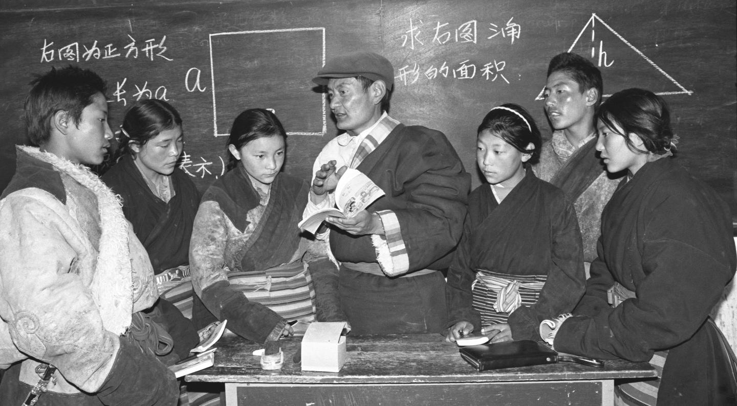 藏北高原班戈縣小學(xué)校長申卻堅(jiān)村(藏族)給學(xué)生上課。(1988年1月30日發(fā))
